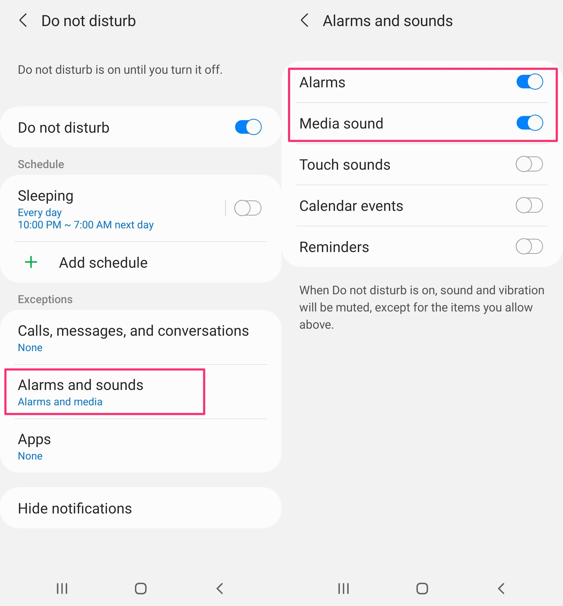 When you use “Do not disturb”, please allow alarms and media sounds. Otherwise, it will not ring. (Menu titles in Settings may vary by OS version, manufacturers, etc.)
